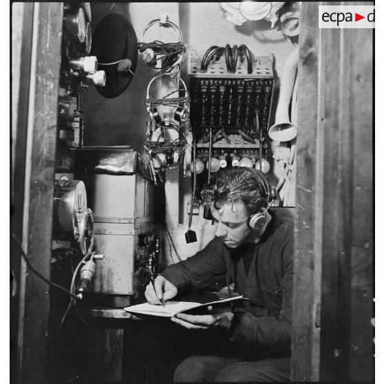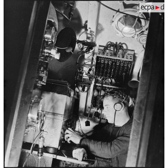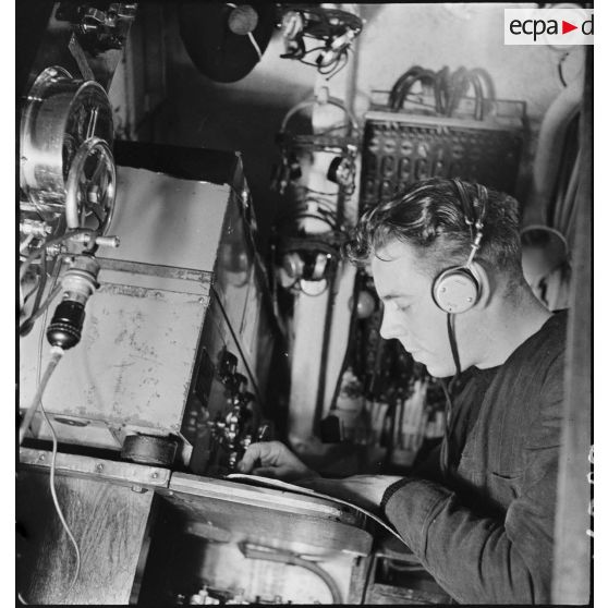 L'opérateur radio du sous-marin des FNFL (Forces navales françaises libres) la Minerve envoie ou réceptionne des messages depuis le poste central radio, au cours d'un exercice.
