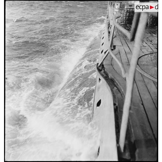 Le sous-marin des Forces navales françaises libres (FNFL) la Minerve fait surface au cours d'un exercice.