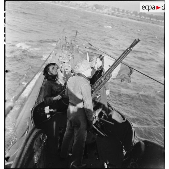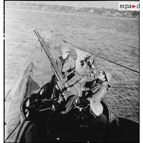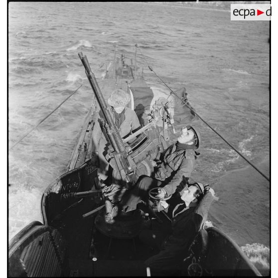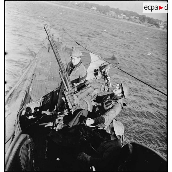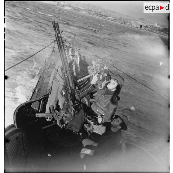 Exercice de tir antiaérien d'une des mitrailleuses Hotchkiss de 13,2 mm du sous-marin des Forces navales françaises libres (FNFL) la Minerve.