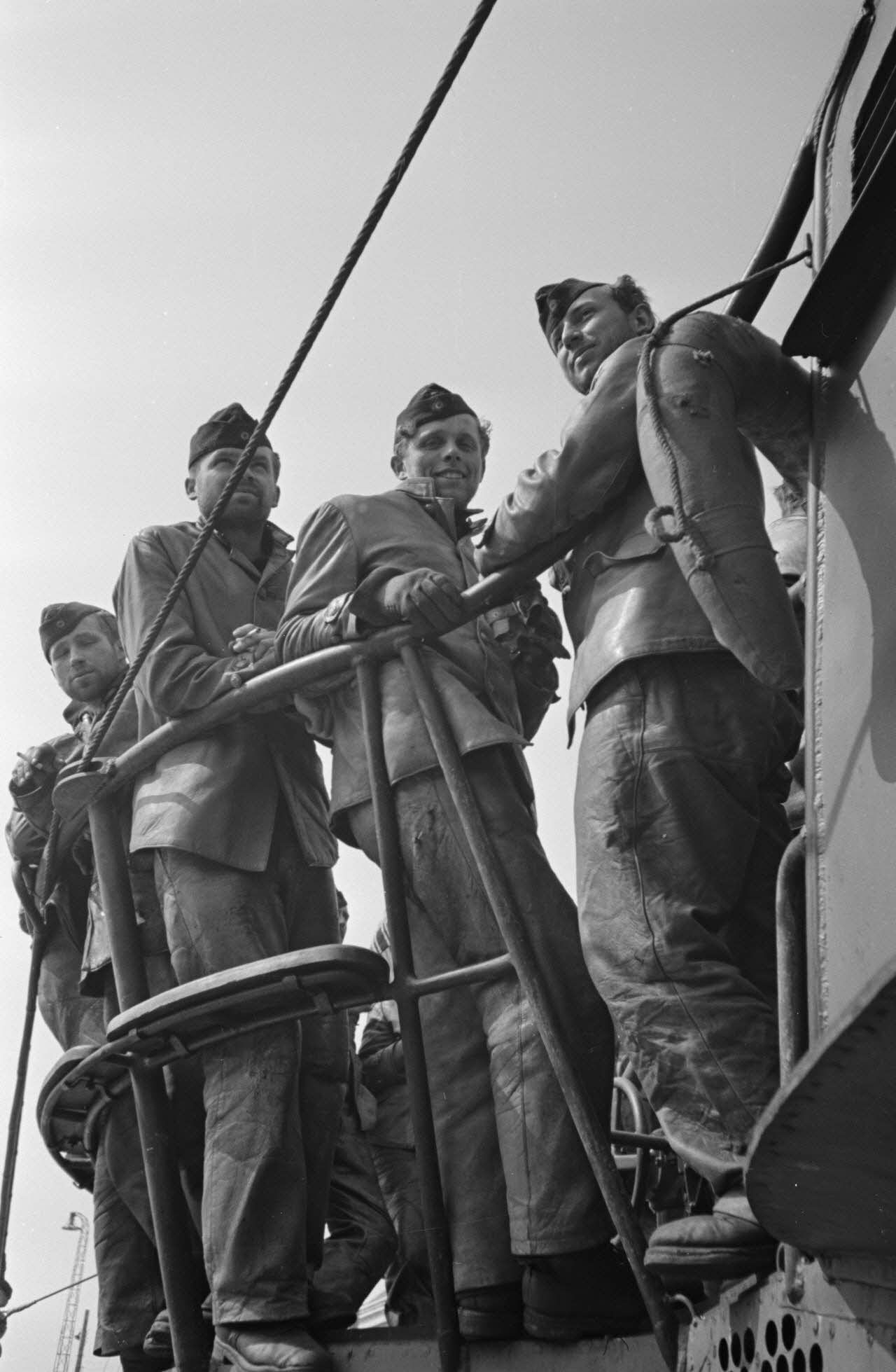Des membres de l'équipage du sous-marin U-553 à leur retour de croisière dans le port de Saint-Nazaire.