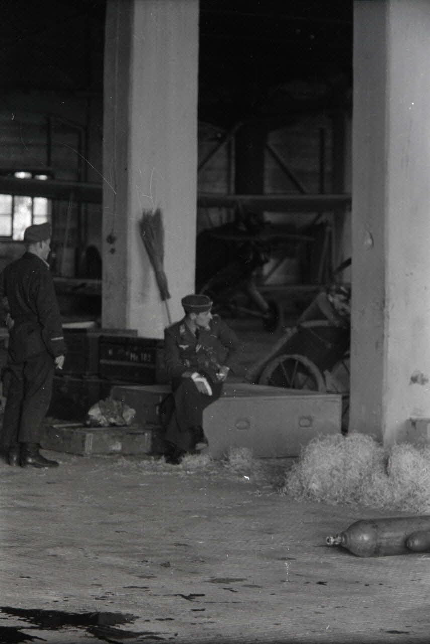 Dans un hangar, le capitaine (Hauptmann) Gerhard Walther assis sur une caisse, l'index de la main droite bandé. Au fond, un Focke-Wulf Fw-44 (LWEK F5932 L22).
