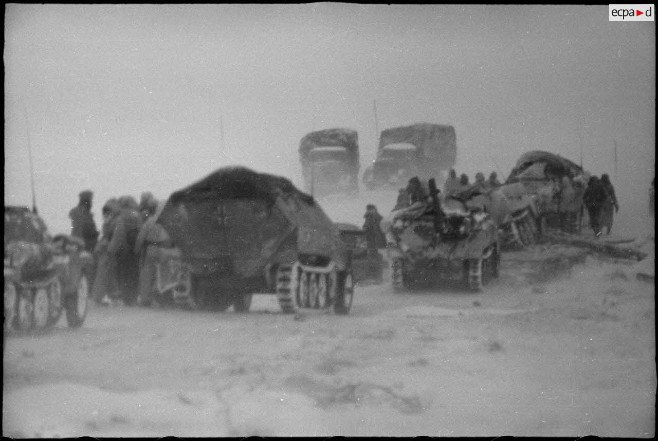 Sous une tempête de neige et du vent, la progression ou la retraite de véhicules chenillés de type Sd.Kfz. 251.