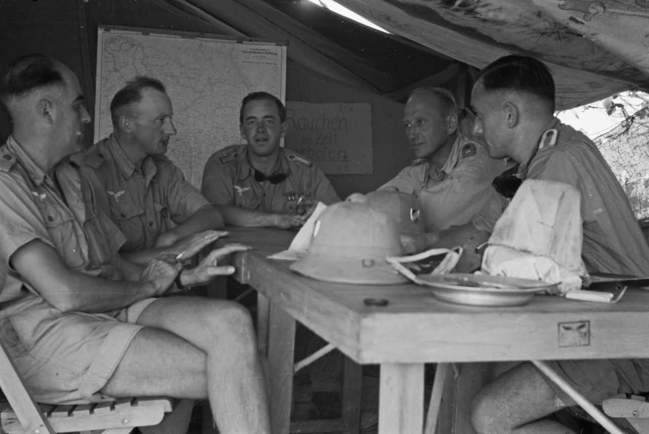 Sous une tente du 4/JG27, un groupe d'aviateur, au centre, un Sonderführer.