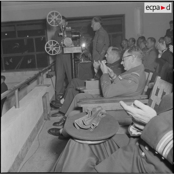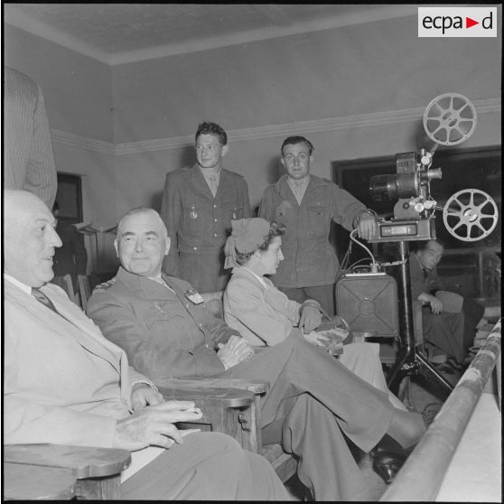 Projection de film organisée pour le 9e anniversaire du début de la bataille du Garigliano à Alger, en présence du général Cailles.