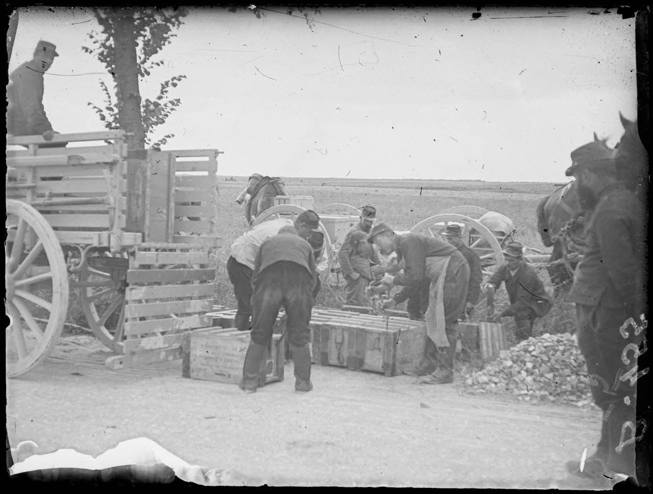 St Etienne près Châlons (4e armée). Ravitaillement en munitions d’artillerie (route de Châlons). [légende d’origine]