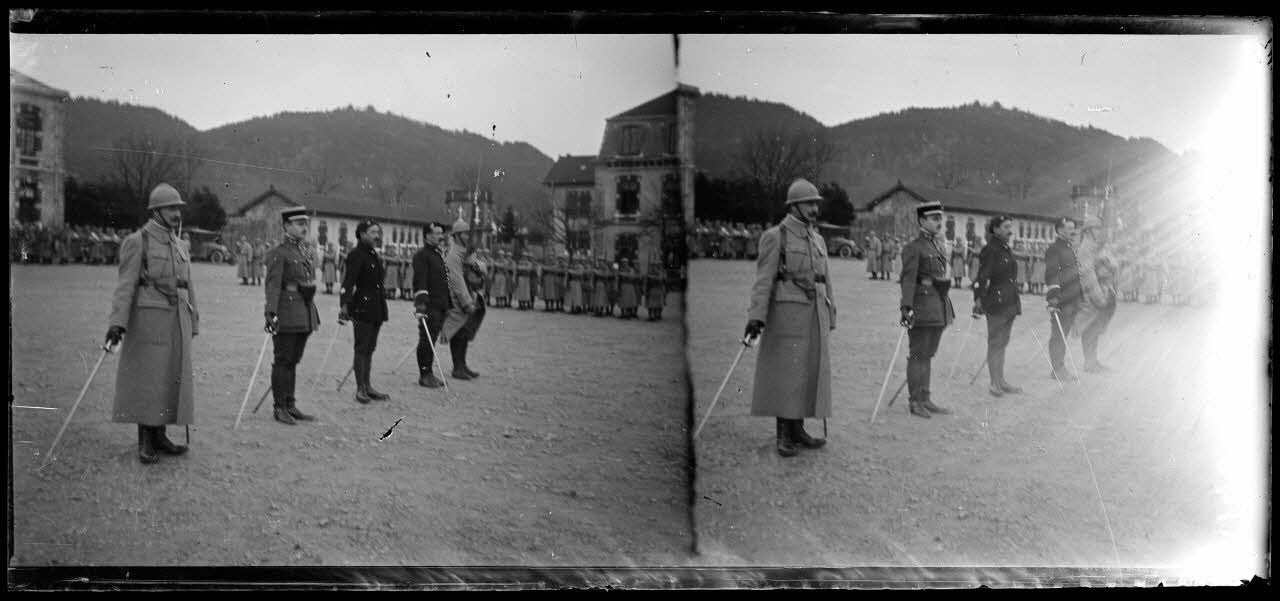St Etienne près Remiremont. Terrain de manoeuvre et caserne Victor. Visite du président Poincaré et du général Joffre. Remise de décoration.
