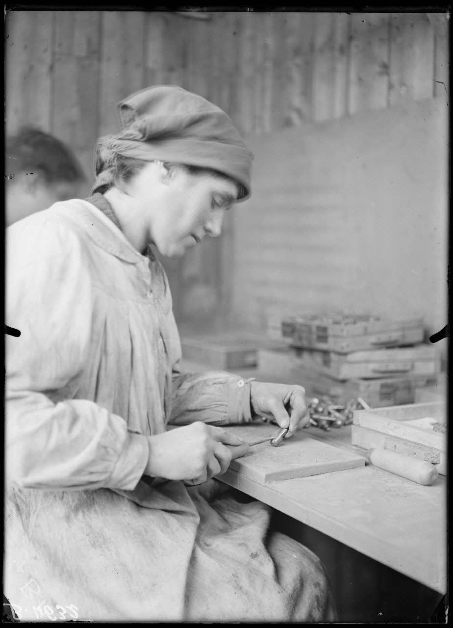 St Ouen, usine Ruggieri, artificier. Chargement et amorçage des fusées d’obus VB. Nettoyage et gommelaquage des fusées.