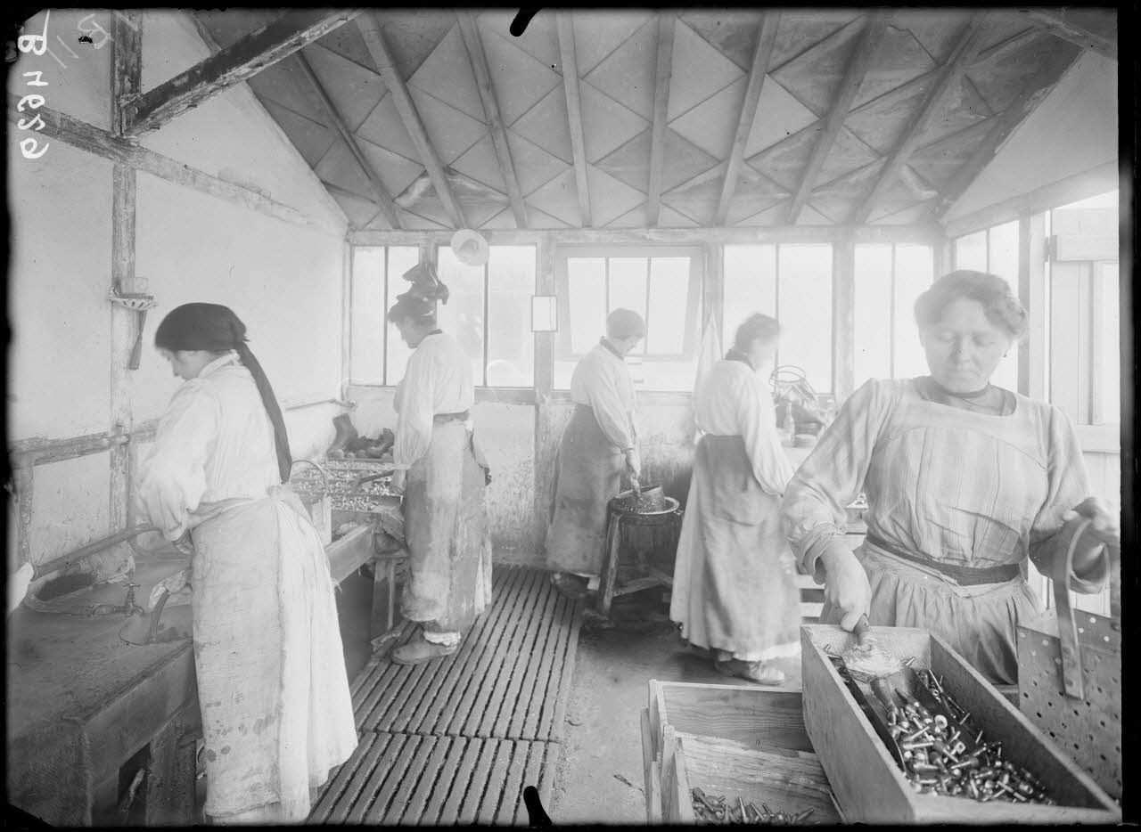 St Ouen, usine Ruggieri, artificier. Chargement et amorçage des fusées d’obus VB. Nettoyage et gommelaquage des fusées. [légende d’origine]