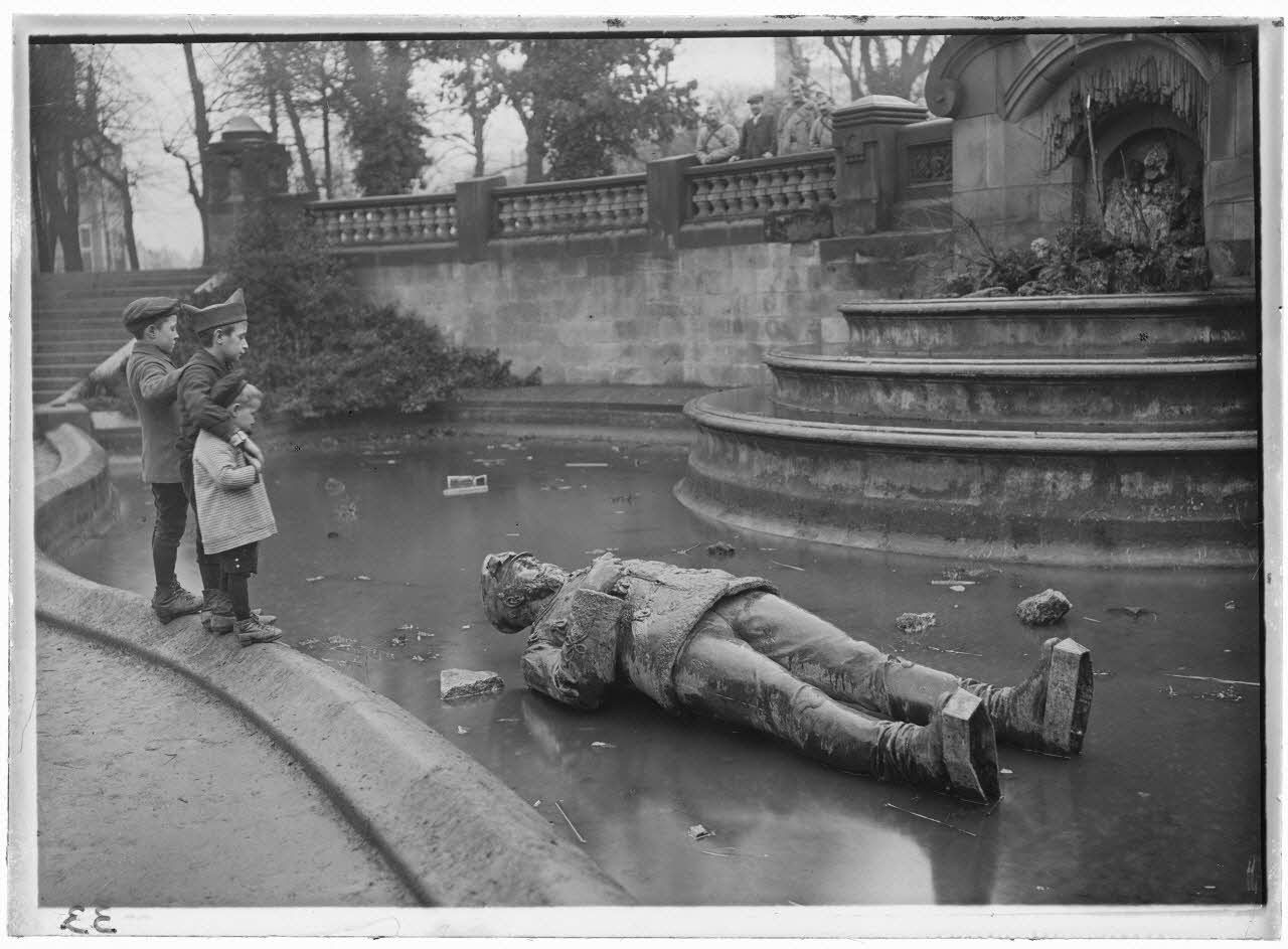 Statue de Frédéric-Charles, jetée au bas de son piédestal et immergée dans un bassin à Metz, 1918.