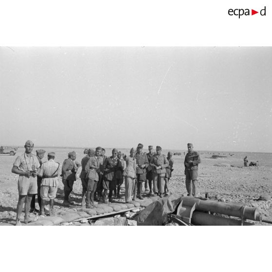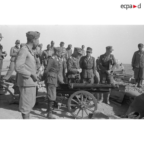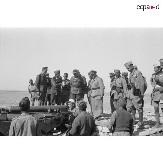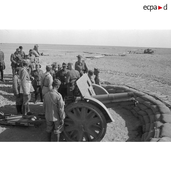 Crüwell et son état-major inspecte une alvéole dotée d'un canon italien de 100/17 modèle de 1914.