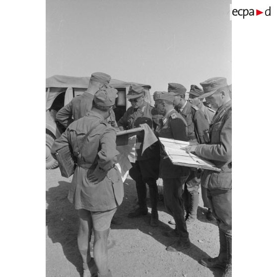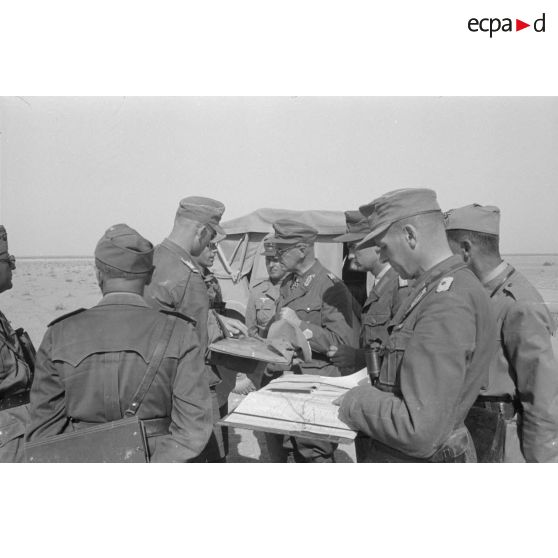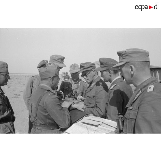 Carte à l'appui, les généraux Ludwig Crüwell et Fedele De Giorgis étudient la position défensive tenue par des unités de l'Axe.