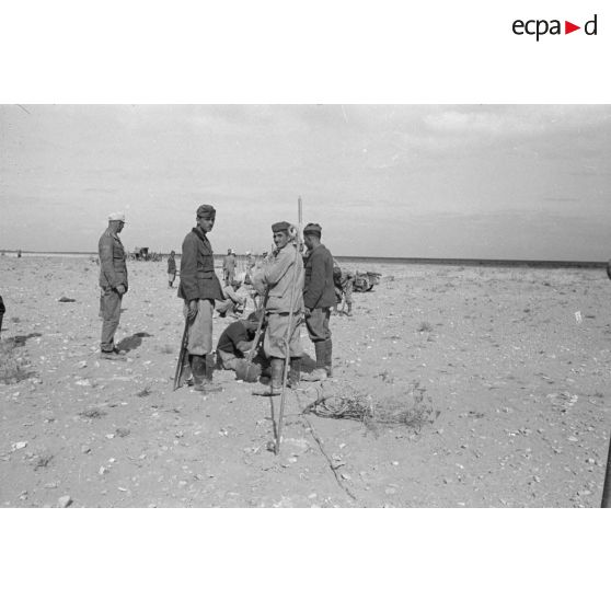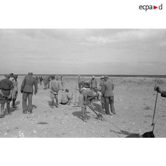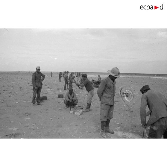 Des soldats allemands et italiens posent un réseau de barbelés.
