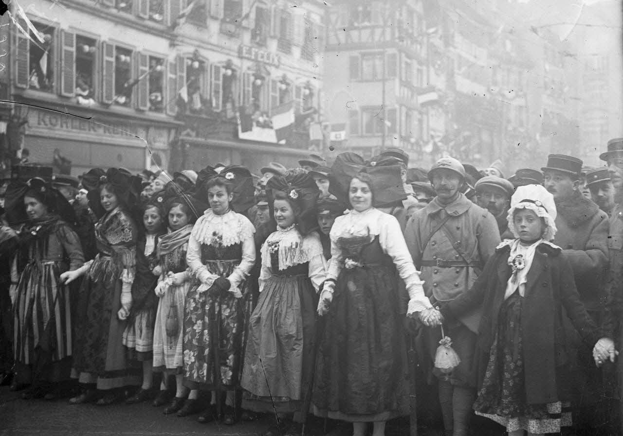 Strasbourg. Entrée du maréchal Pétain. Alsaciennes en costume et soldats.