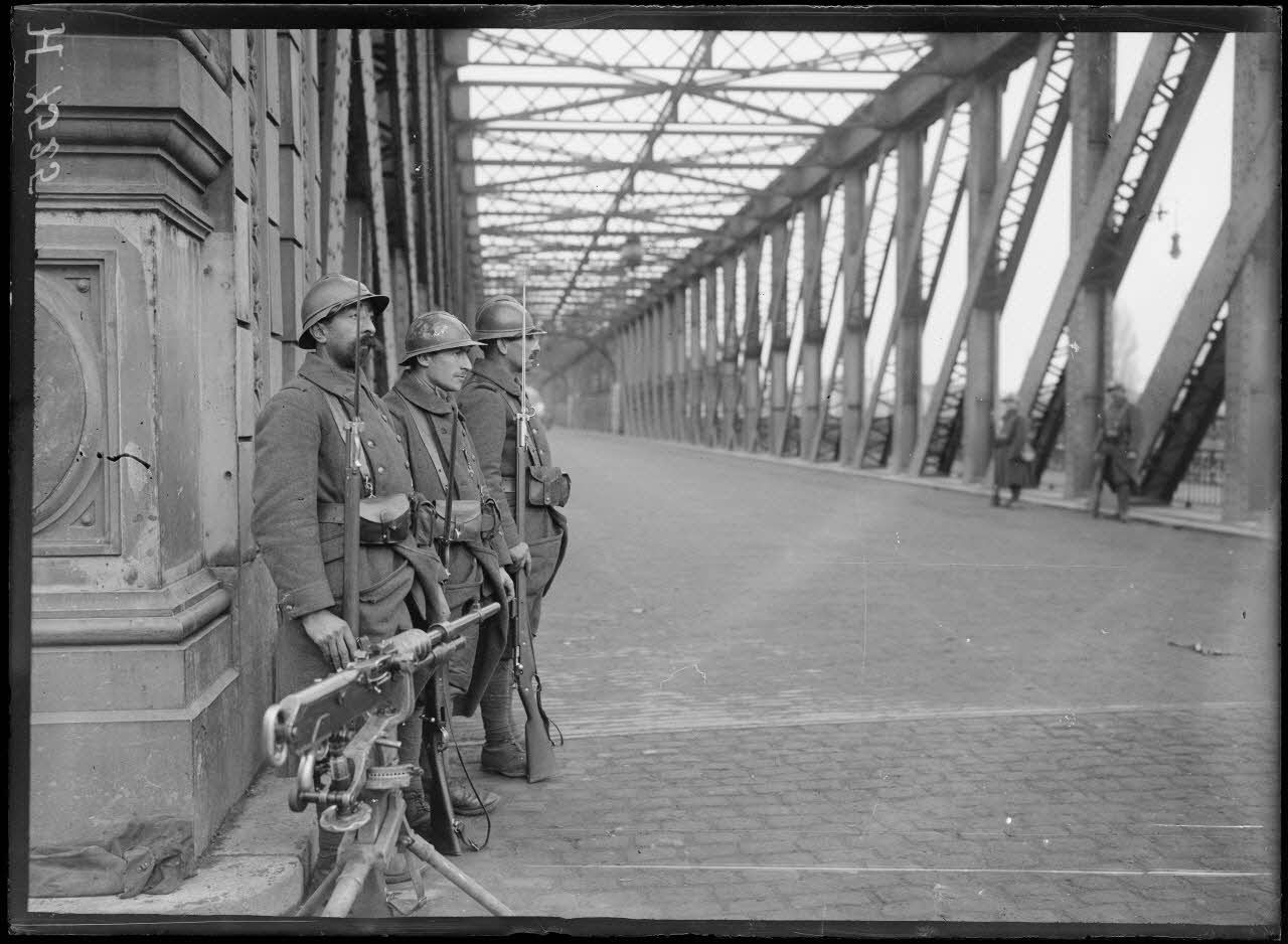 A Strasbourg, au début du mois de décembre 1918, des soldats alsaciens libérés du service militaire allemand passent sur le pont Kehl, gardé à chaque extrémité par des sentinelles (d'un côté sentinelles allemandes, de l'autre sentinelles françaises). Les évacués en provenance d'Allemagne sont triés. Sur ce pont, des officiers français réceptionnent des camions allemands (camions Dameler avec roues ferrées à amortisseurs remplaçant les pneumatiques).