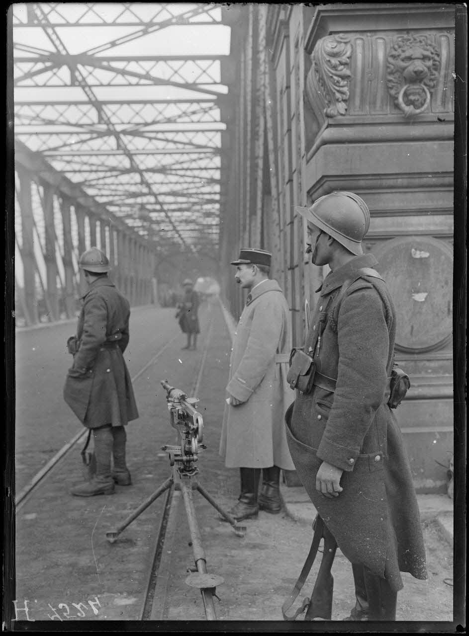 A Strasbourg, au début du mois de décembre 1918, des soldats alsaciens libérés du service militaire allemand passent sur le pont Kehl, gardé à chaque extrémité par des sentinelles (d'un côté sentinelles allemandes, de l'autre sentinelles françaises). Les évacués en provenance d'Allemagne sont triés. Sur ce pont, des officiers français réceptionnent des camions allemands (camions Dameler avec roues ferrées à amortisseurs remplaçant les pneumatiques).