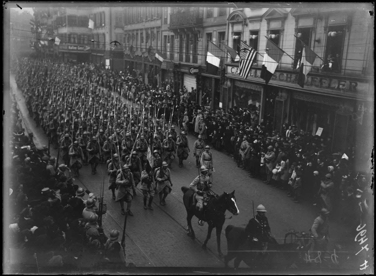 Accueil des troupes par la population à Strasbourg, novembre 1918.