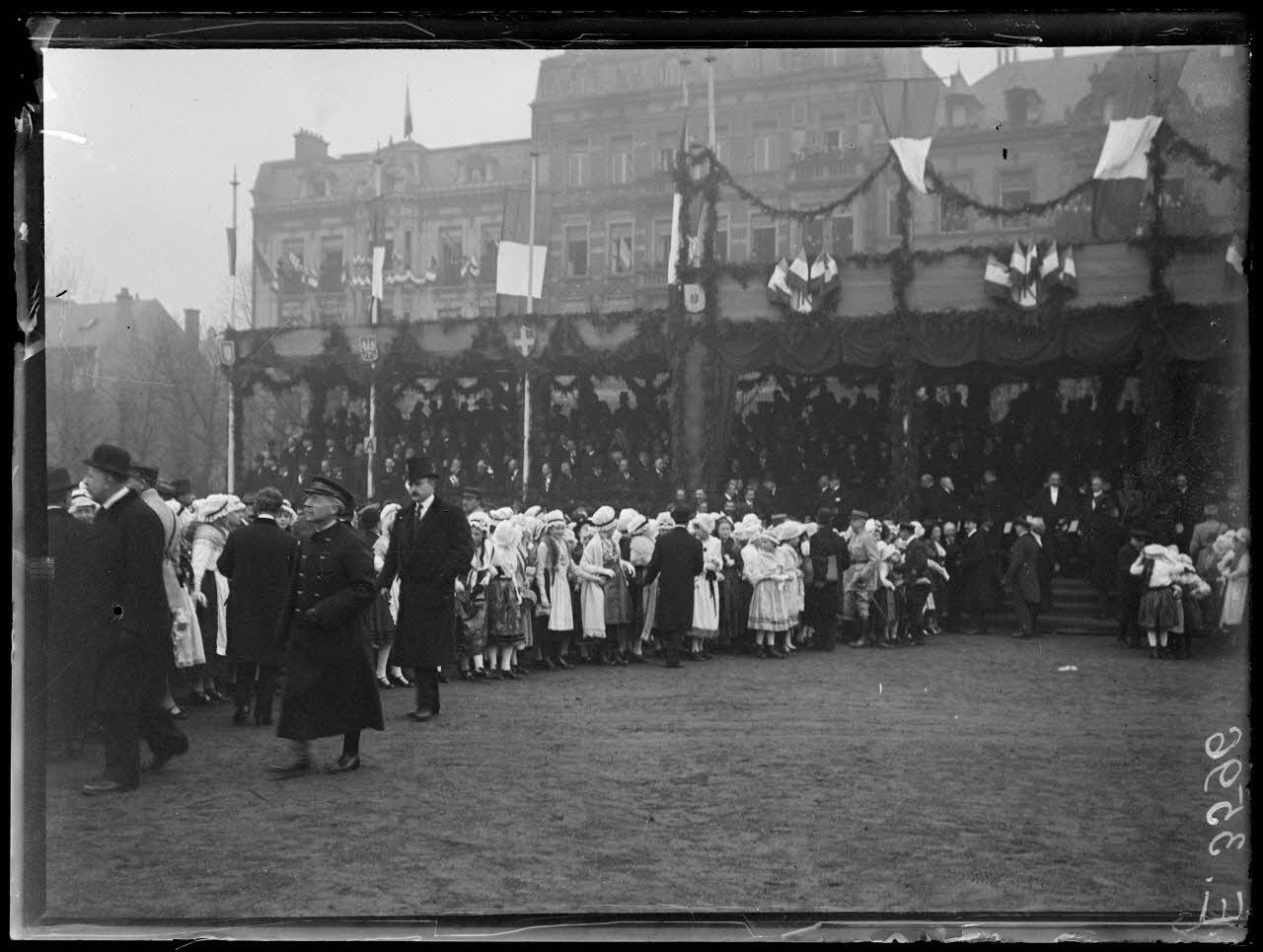 Note : dans le registre de légendes d'origine, le cliché est censé avoir été pris à Strasbourg. Mais il semble qu'il s'agit plutôt de la place d'armes de Metz. Les jeunes filles sont d'ailleurs en costume lorrain.