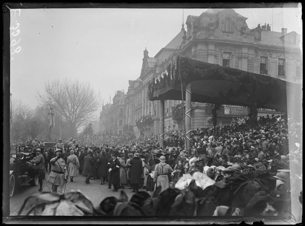 Metz. Voyage de Mr Poincaré. Le Président et Mr Clemenceau montent à la tribune officielle.