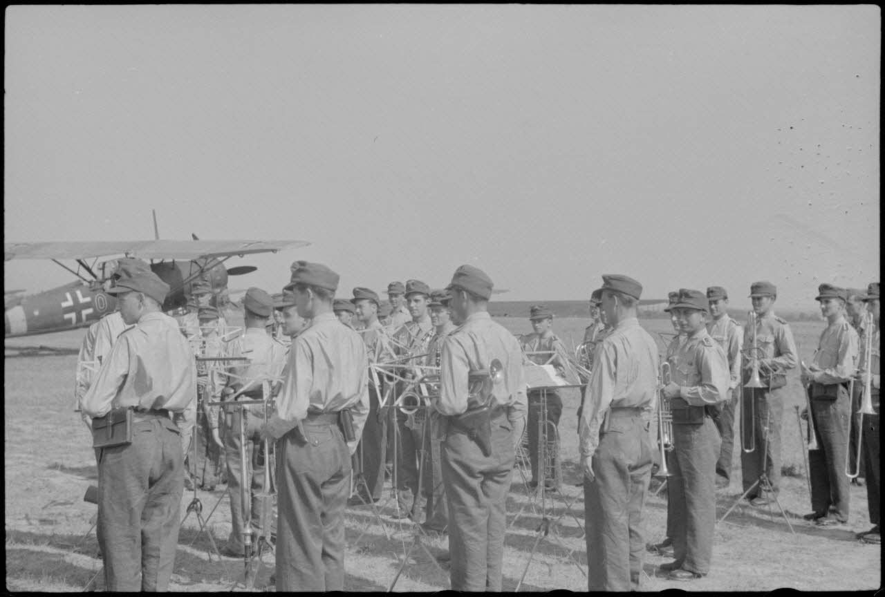 Sur l'aérodrome de Lézignan-Corbières, des musiciens de la Luftwaffe viennent divertir le personnel du Luftlandegeschwader 1.