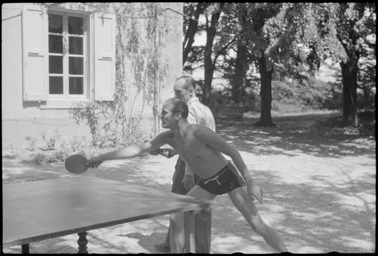 A proximité du terrain d'avion de Lézignan-Corbières, des officiers de la 1re escadrille aéroportée (Sondergruppe du Luftlandegeschwader 1) jouent au ping-pong.