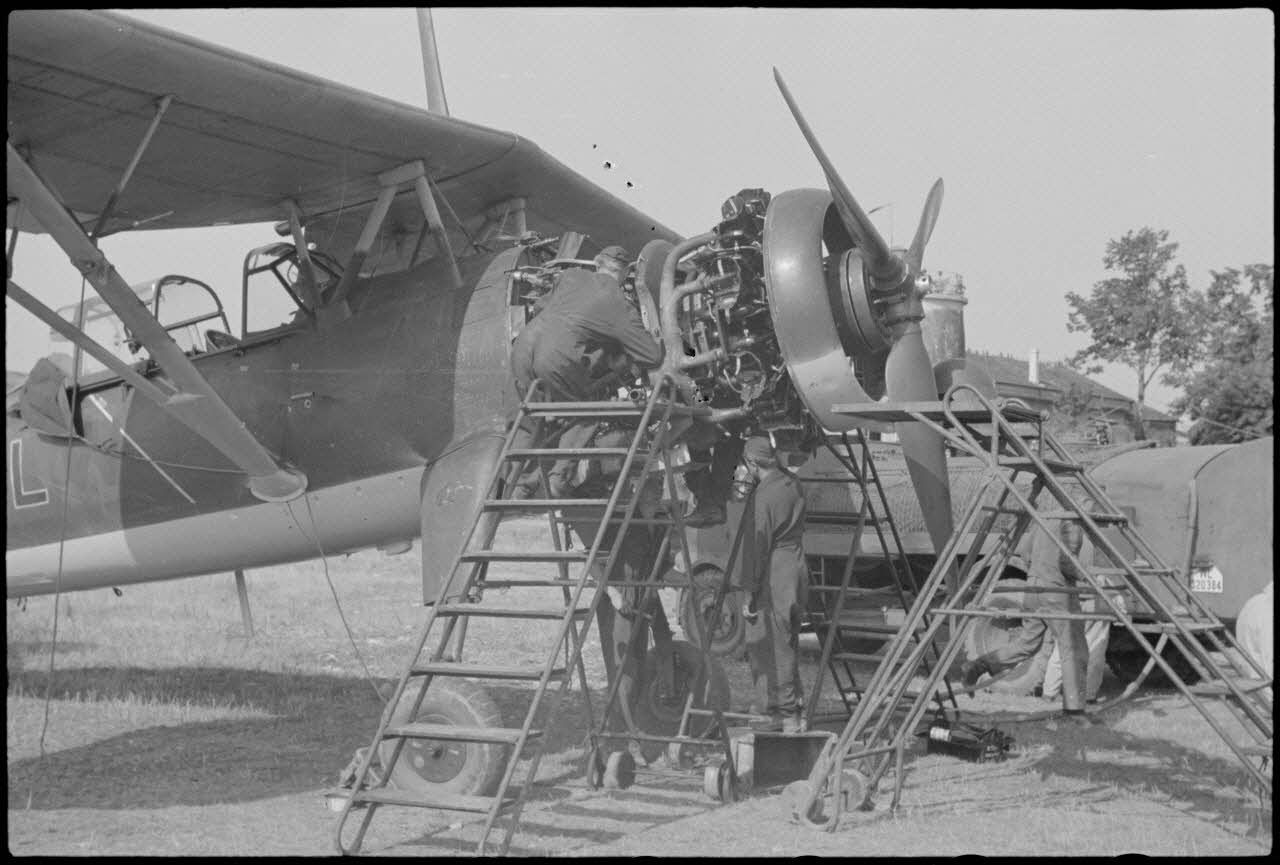 Sur l'aérodrome de Valence-Chabeuil (Drôme), le personnel au sol du Luftlandegeschwader 1 vérifie un avion de reconnaissance Henschel Hs-126 utilisé ici comme tracteur de planeurs.