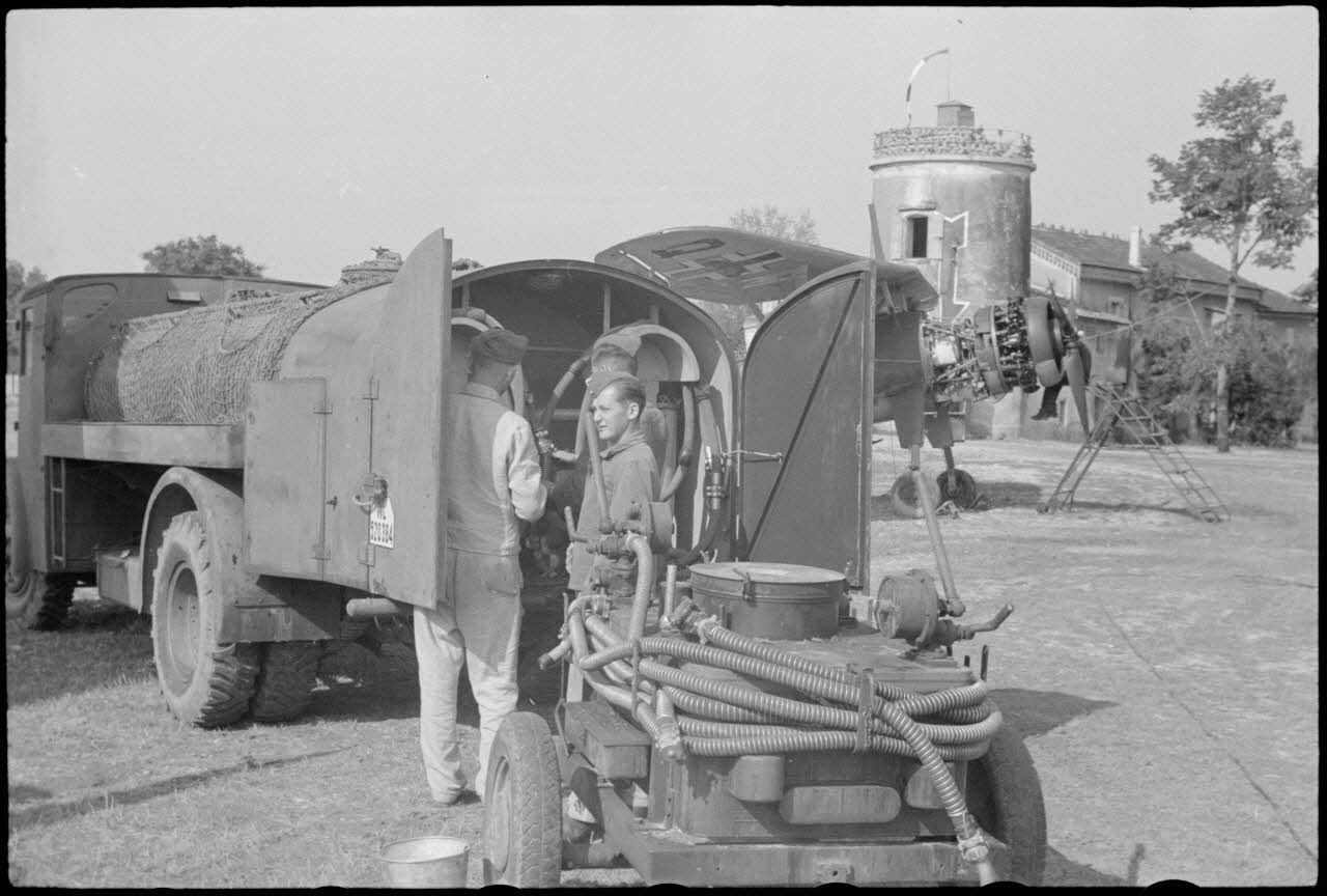 Sur l'aérodrome de Valence-Chabeuil (Drôme), le personnel au sol du Luftlandegeschwader 1 vérifie un avion de reconnaissance Henschel Hs-126 utilisé ici comme tracteur de planeurs.