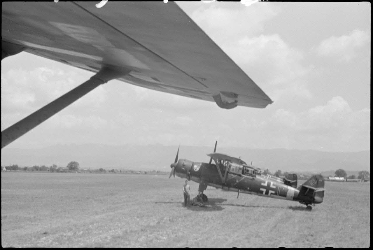 Sur l'aérodrome de Valence-Chabeuil (Drôme), le personnel au sol du Luftlandegeschwader 1 vérifie un Henschel Hs-126 avion une mission.