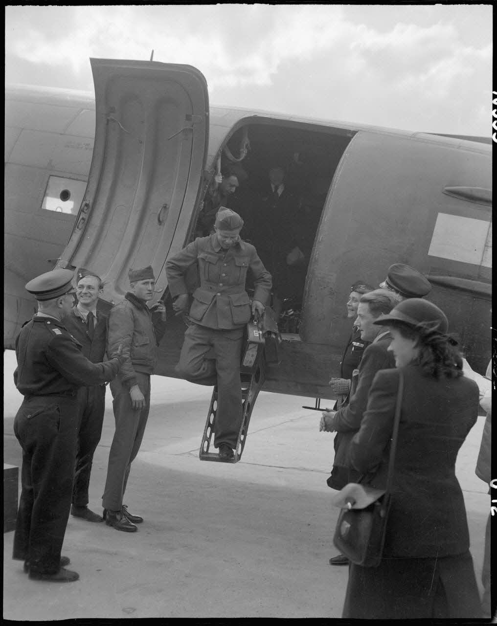 Sur l'aéroport du Bourget, Jules Carron, millionième prisonnier français libéré rapatrié, descend d'un avion de transport Douglas C-47 Dakota de l'armée américaine.
