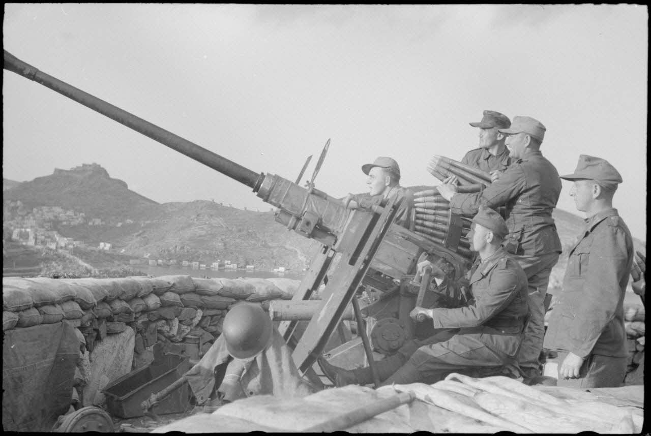 Sur l'île de Leros, des artilleurs allemands derrière un canon antiaérien 40 mm Bofors.