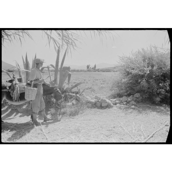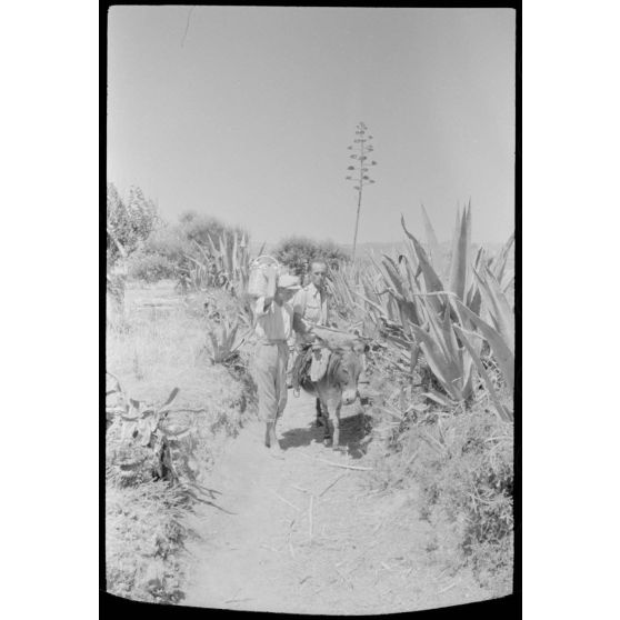 Un habitant de Naxos accompagné de son âne pose devant une agave.