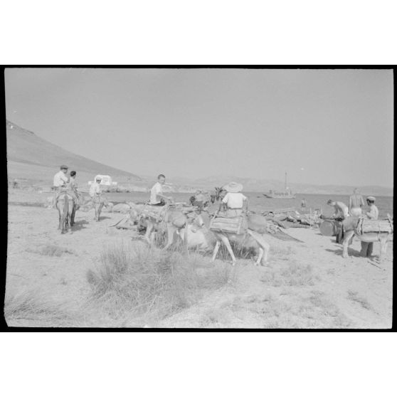 Sur la côte de l'île de Naxos, des habitants sont réquisitionnés pour le transport de jerrycans.