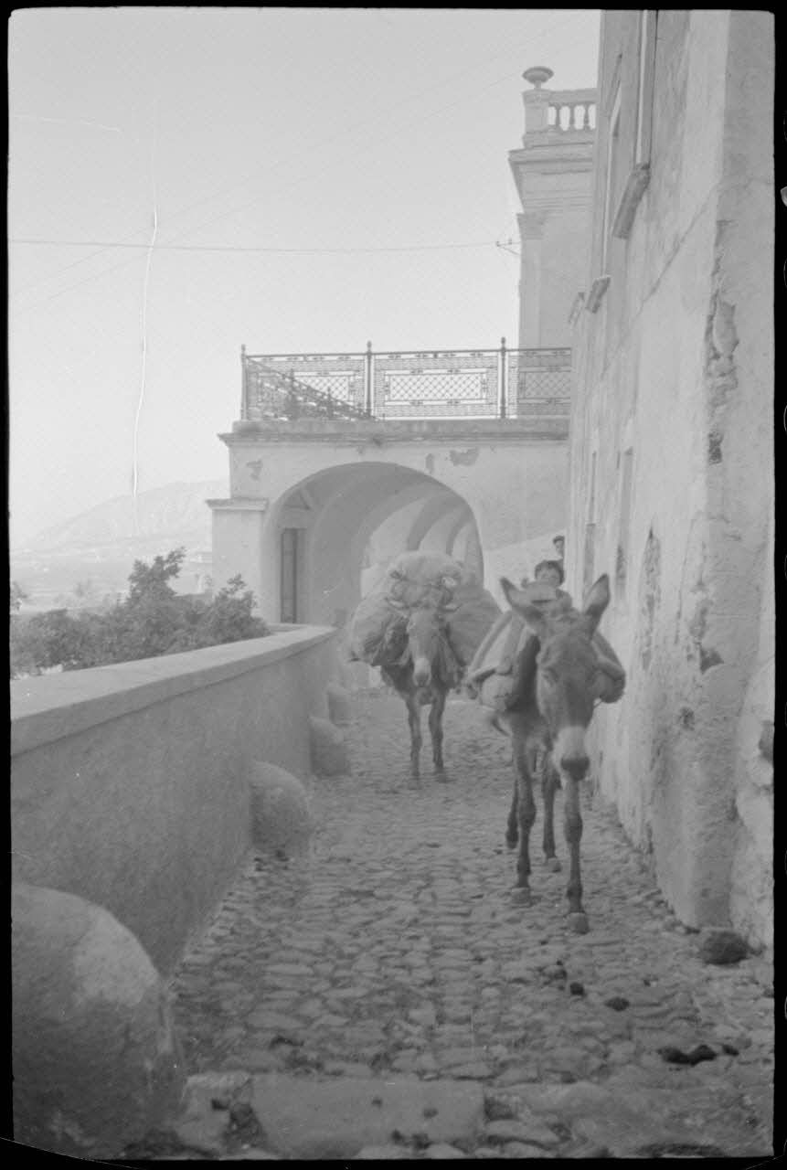 Sur l'île de Naxos, mulets chargés dans une rue.