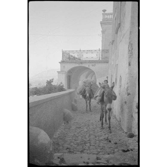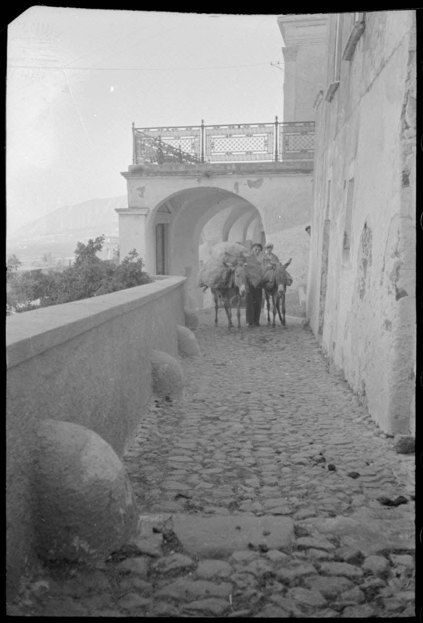 Sur l'île de Naxos, mulets chargés dans une rue.