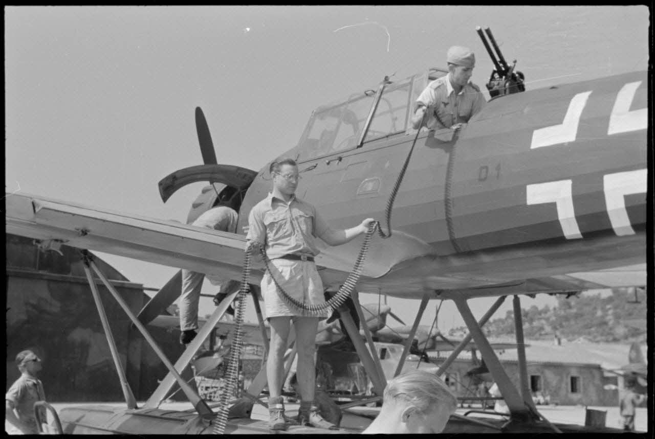 Sur la base de Skaramangas occupée par le 1er groupe du Seeaufklärungsgruppe 126, des mécaniciens approvisionnent la mitrailleuse MG-17 située sous le capot moteur de l'Arado Ar-196.