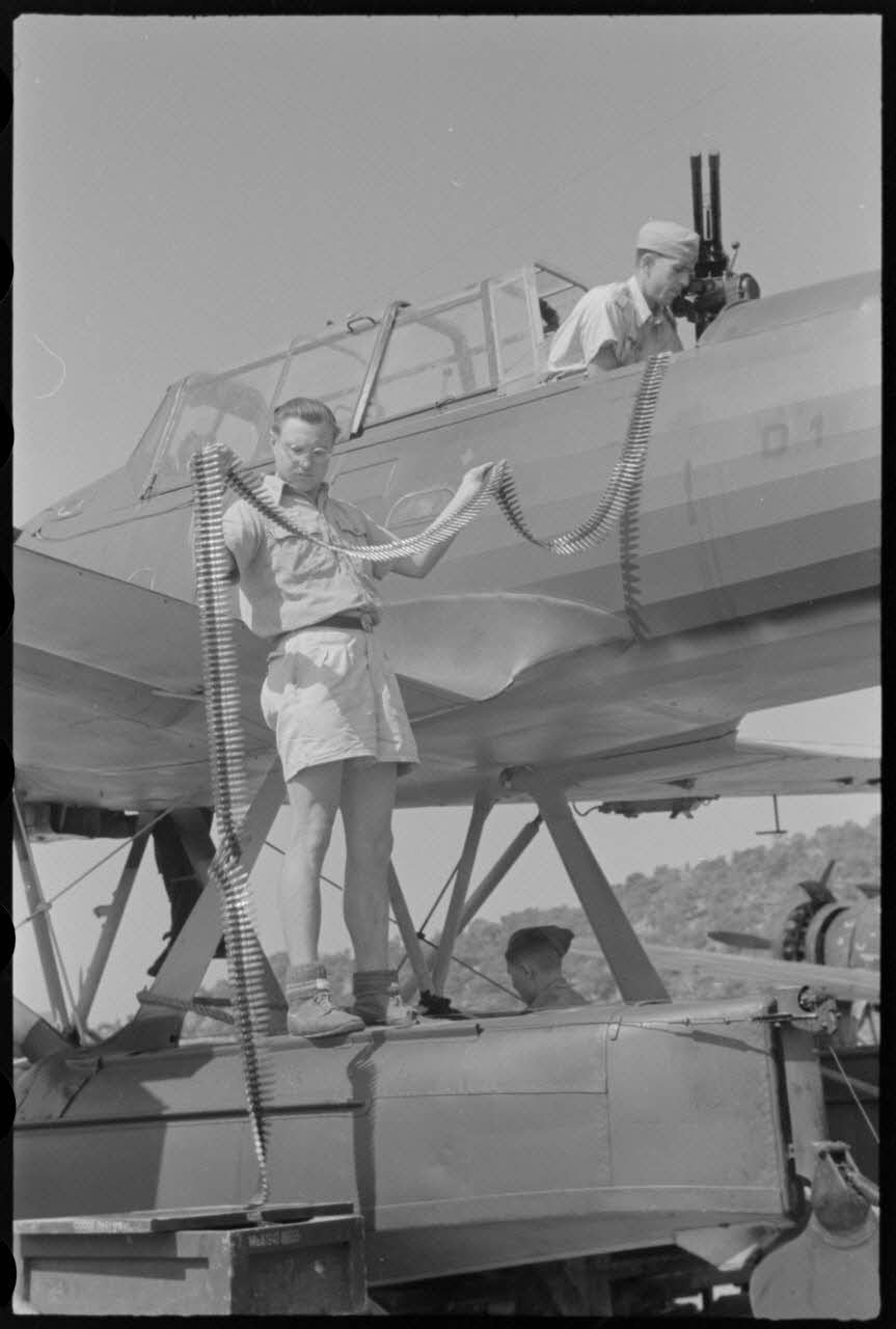 Sur la base de Skaramangas, approvisionnement des mitrailleuses MG-81d'un hydravion Arado Ar-196 codé D1+BK du Seeaufklärungsgruppe 126.