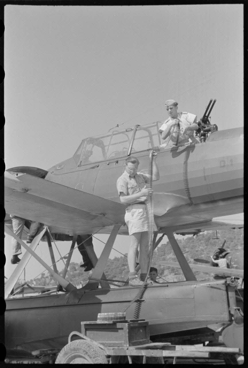 Sur la base de Skaramangas occupée par le 1er groupe du Seeaufklärungsgruppe 126, des mécaniciens approvisionnent la mitrailleuse MG-17 située sous le capot moteur de l'Arado Ar-196.