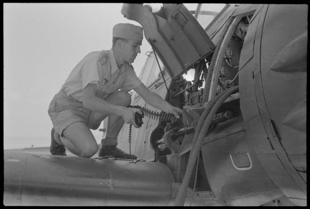 Sur la base de Skaramangas occupée par le 1er groupe du Seeaufklärungsgruppe 126, des mécaniciens approvisionnent la mitrailleuse MG-17 située sous le capot moteur de l'Arado Ar-196.