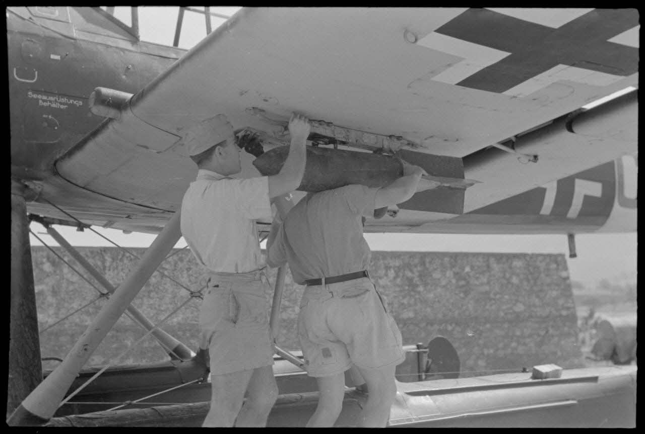 Sur la base de Skaramangas, deux mécaniciens de bord du Seeaufklärungsgruppe 126 approvisionnent les mitrailleuses MG-81 d'un hydravion Arado Ar-196 codé D1+BK.