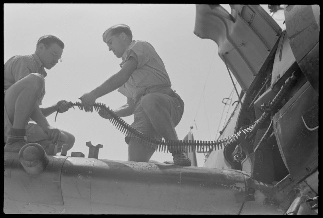 Sur la base de Skaramangas occupée par le 1er groupe du Seeaufklärungsgruppe 126, des mécaniciens approvisionnent la mitrailleuse MG-17 située sous le capot moteur de l'Arado Ar-196.