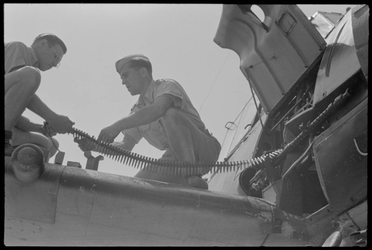 Sur la base de Skaramangas occupée par le 1er groupe du Seeaufklärungsgruppe 126, des mécaniciens approvisionnent la mitrailleuse MG-17 située sous le capot moteur de l'Arado Ar-196.