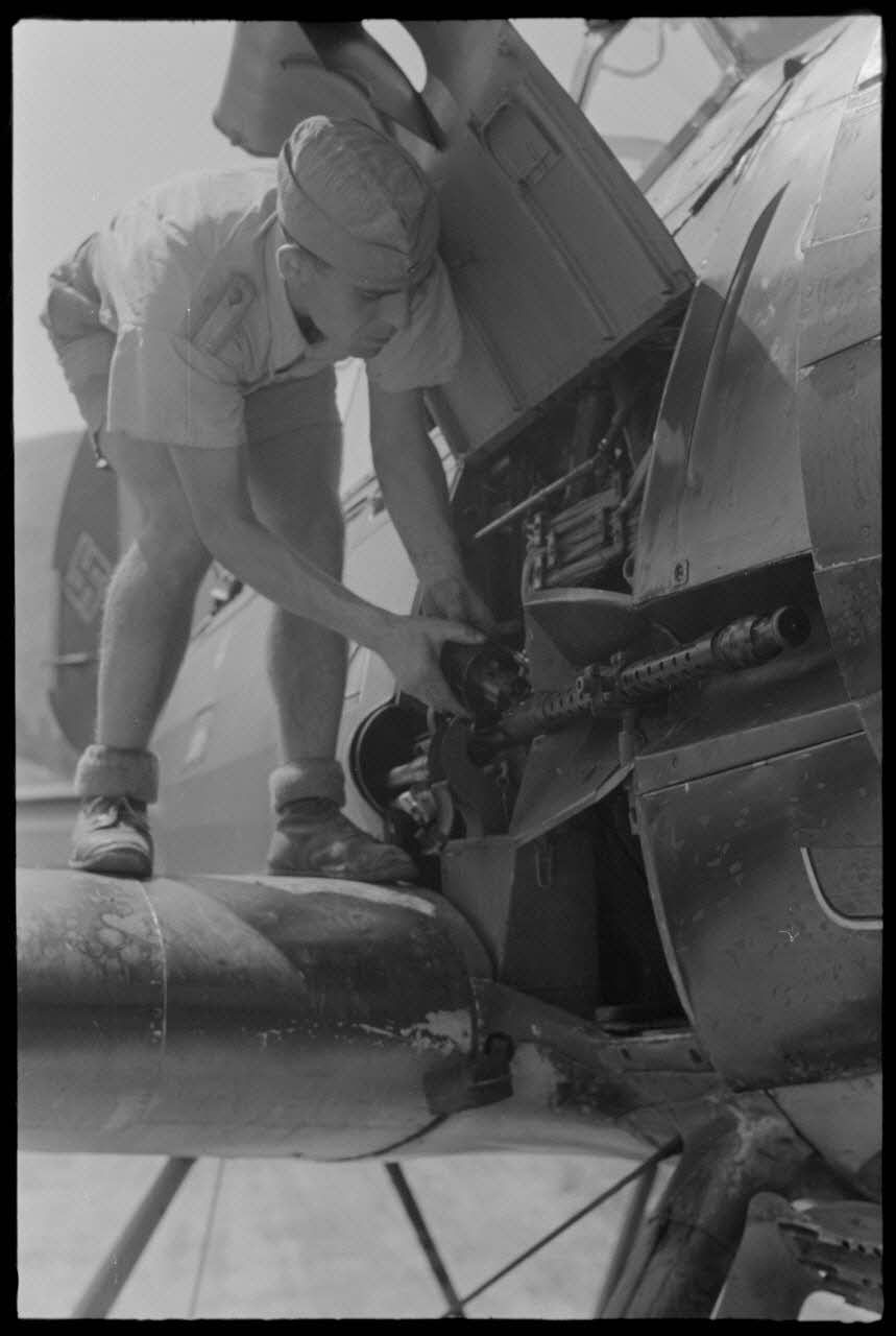 Sur la base de Skaramangas occupée par le 1er groupe du Seeaufklärungsgruppe 126, des mécaniciens approvisionnent la mitrailleuse MG-17 située sous le capot moteur de l'Arado Ar-196.