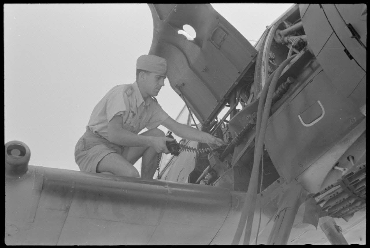 Sur la base de Skaramangas occupée par le 1er groupe du Seeaufklärungsgruppe 126, des mécaniciens approvisionnent la mitrailleuse MG-17 située sous le capot moteur de l'Arado Ar-196.