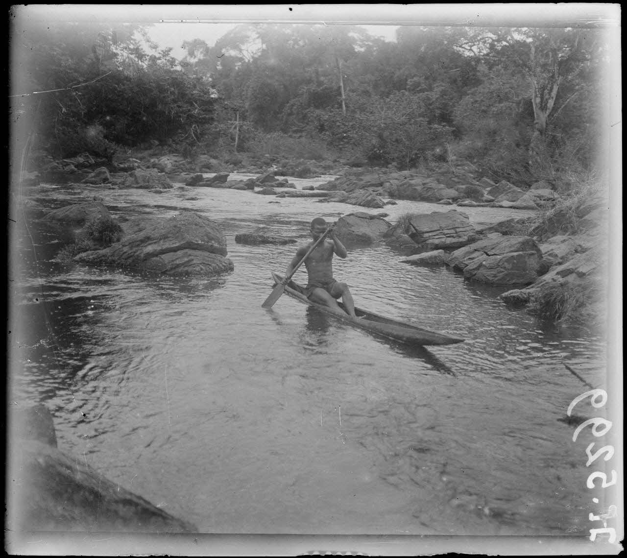 Sur la Bongola. Une petite pirogue de 2m50 de long et 0m15 de large. [légende d'origine]