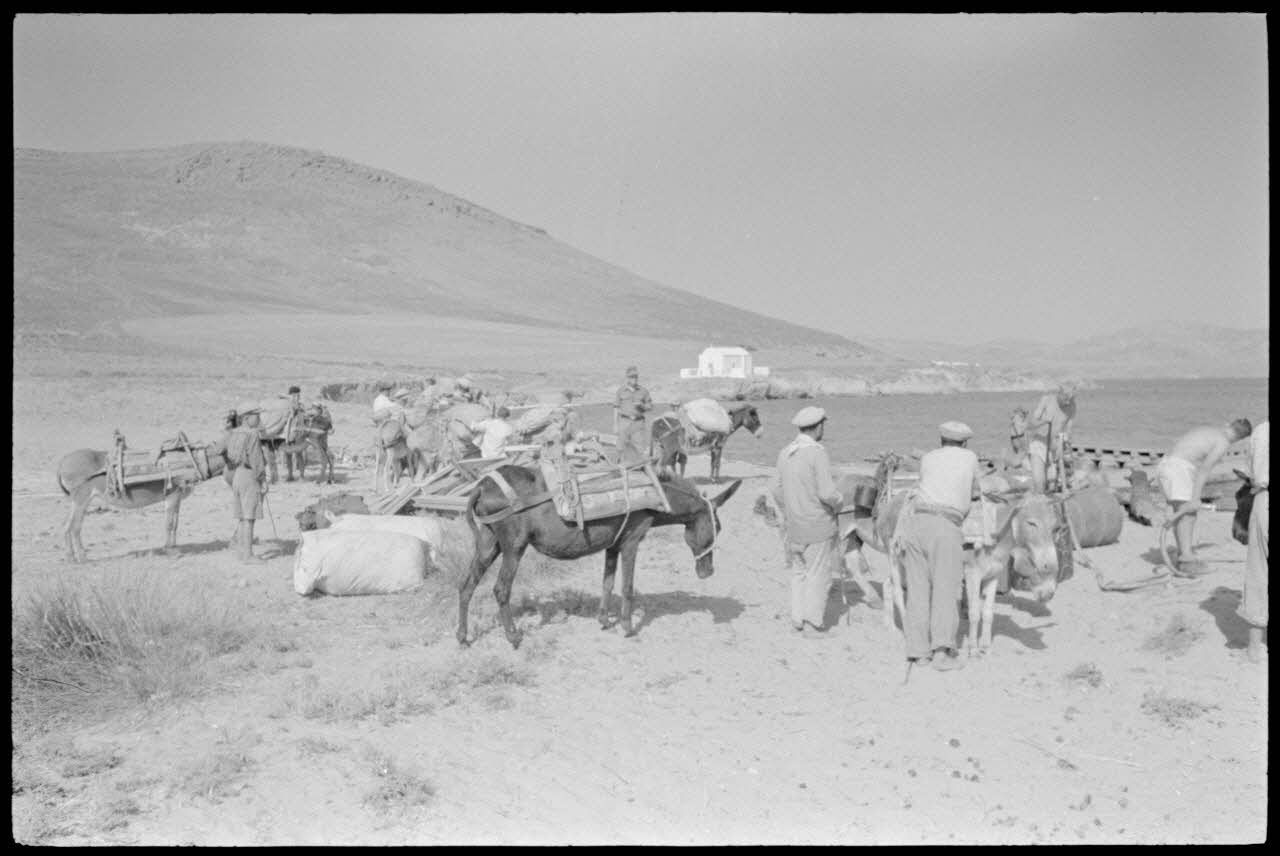 Sur la côte de l'île de Naxos, des habitants sont réquisitionnés pour le transport de jerrycans.