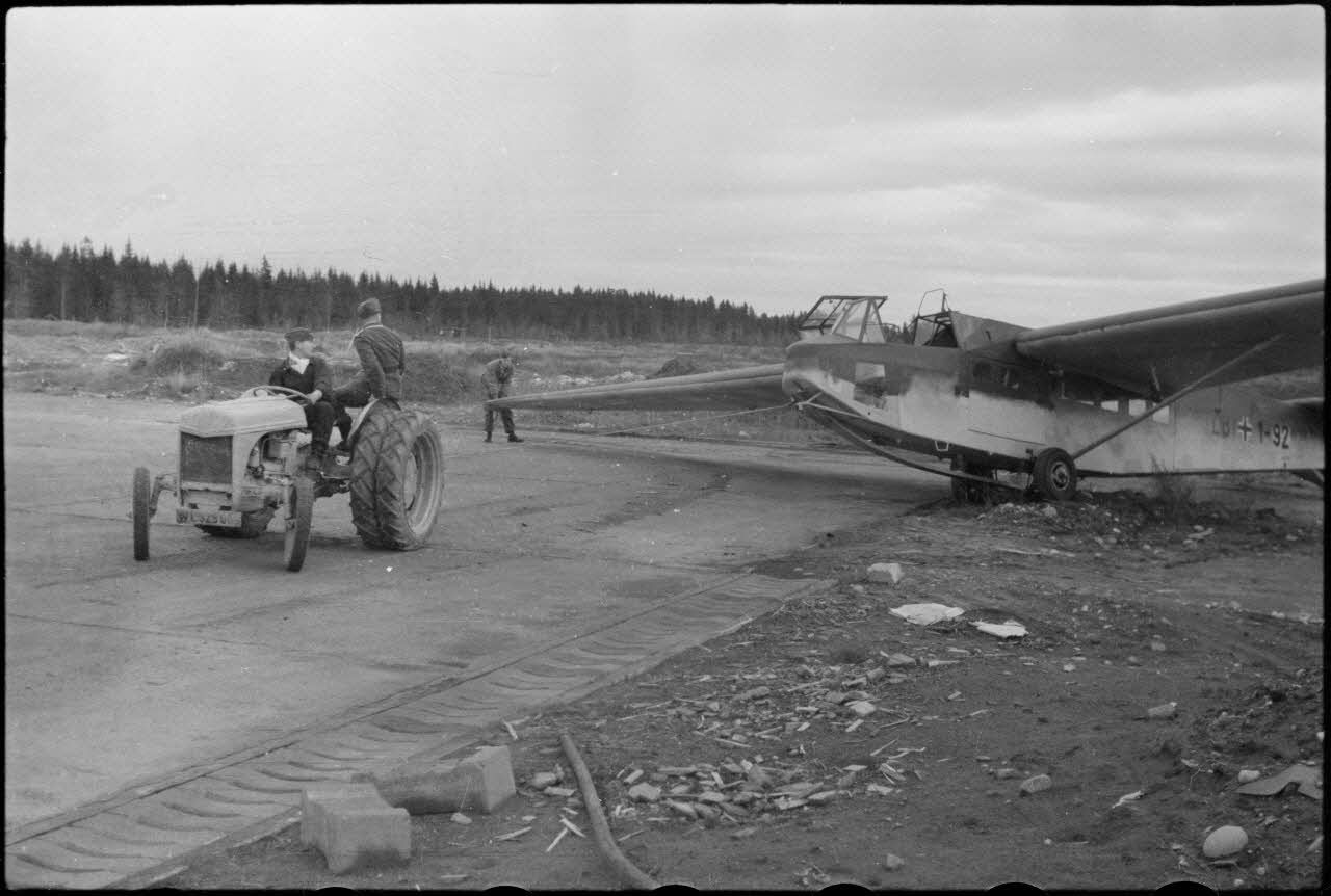 Sur la piste du terrain d'aviation, un tracteur agricole tracte le planeur DFS-230 du Luftlandegeschwader 1 (8./LLG 1) vers un nouvel emplacement. Le planeur est baptisé "Sieg" (immatriculation LB+1-92).