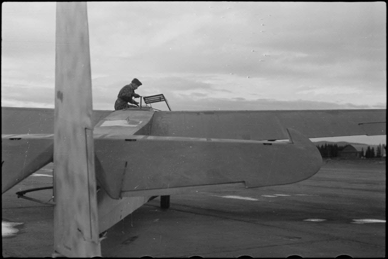 Des vérifications d'usage avant une mission pour un planeur DFS-230 du Luftlandegeschwader 1 (8./LLG 1) sur la piste du terrain d'aviation de Banak.