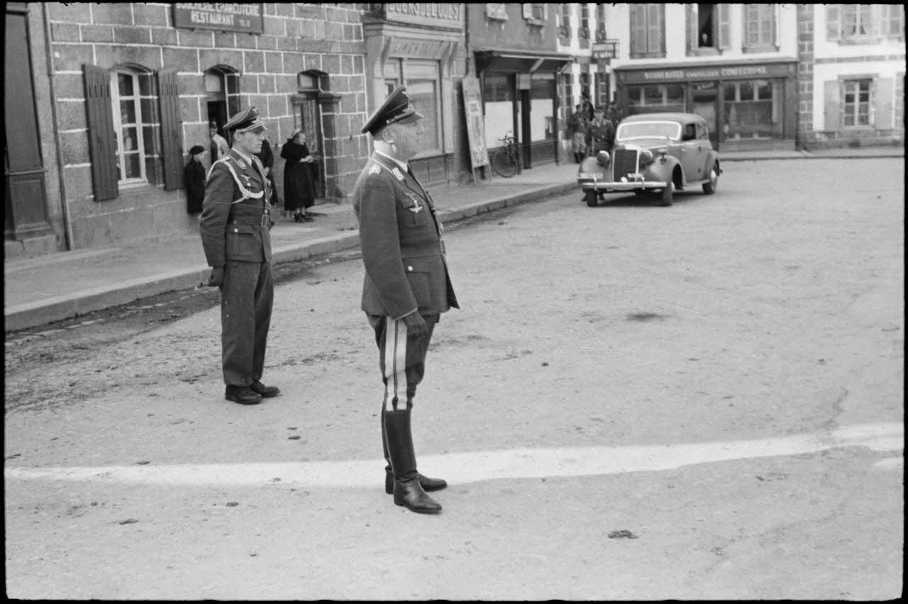 Un groupe d'officiers de la 3.Fallschirmjäger.Division lors d'une prise d'armes sur la place de Huelgoat (Finistère centre).