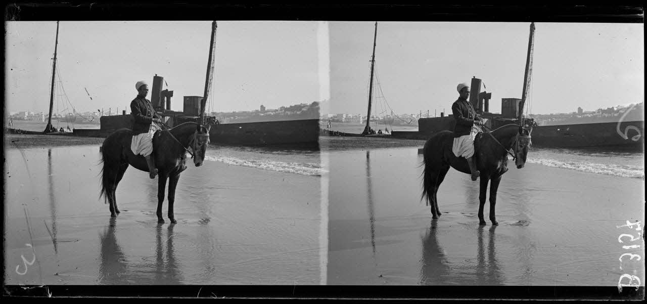 Sur la plage de Salé, tirailleur indigène à cheval. [légende d’origine]