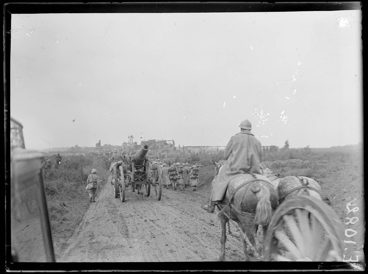 Sur la route de Dompierre à Fontaine-lès-Cappy. Canon allemand de 150 emmené à l'arrière (au fond les ruines de la sucrerie de Fontaine-lès-Cappy). [légende d'origine]