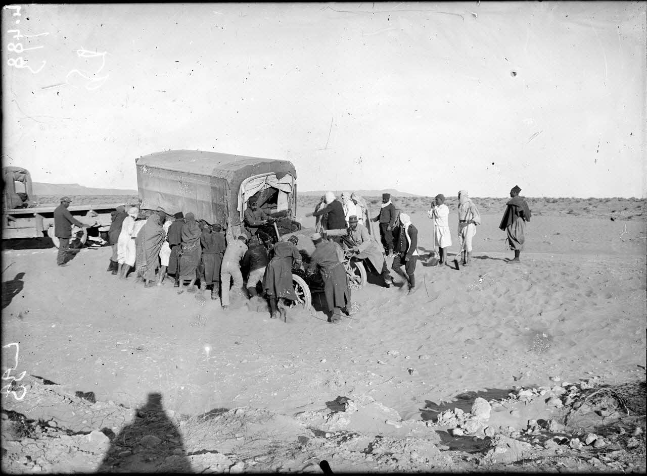 Sur la route de Gabès à Foum Tataouine. Les Arabes viennent prêter main forte pour sortir des dunes l'auto enlisée. [légende d'origine].